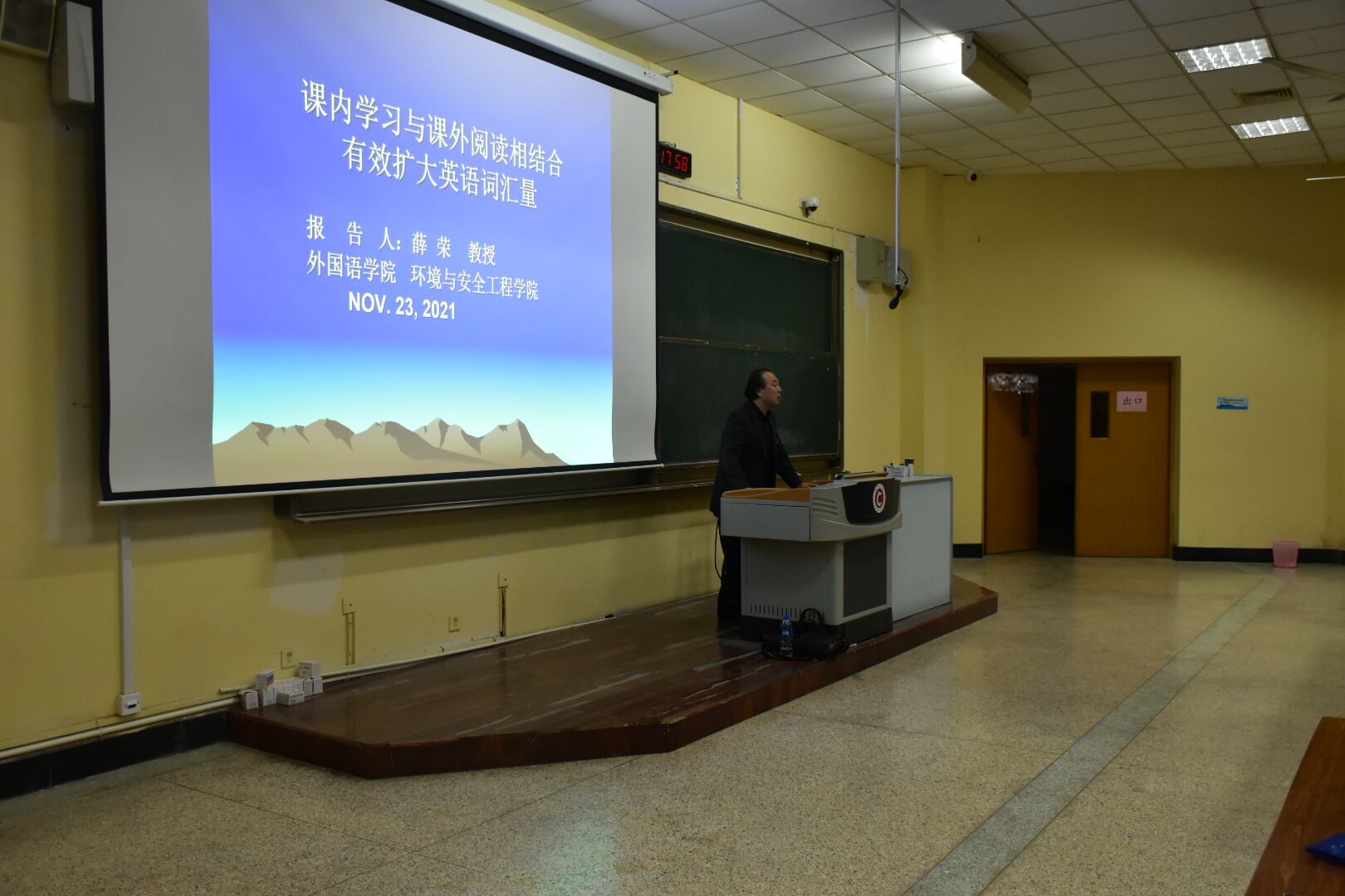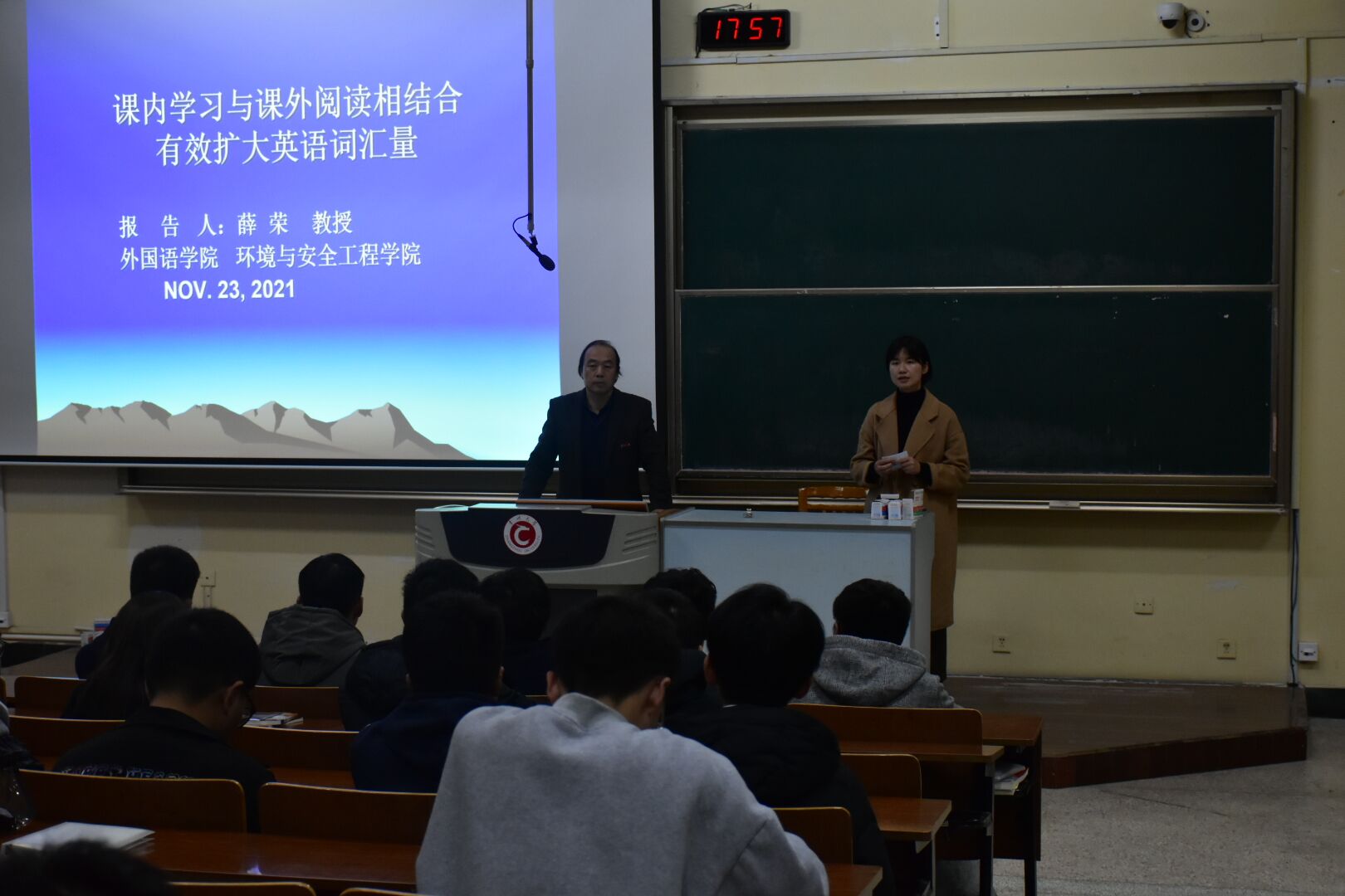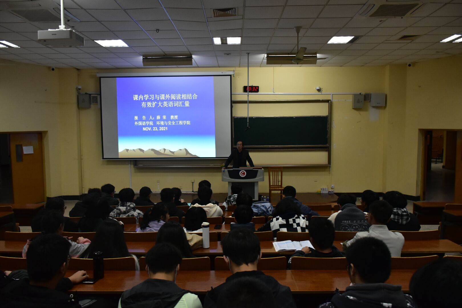 为了增强学生的英语能力,掌握更多英语的方法和技巧,更好的通过四级考试,也为以后考研提供助力。环境安全与工程学院于2021年12月23日(周二)晚上7:30开展课内学习与课外阅读相结合有效扩大英语词汇量的讲座。此次讲座由外国语学院的薛荣教授讲授,2021届环境院新生在阶梯教室进行学习。