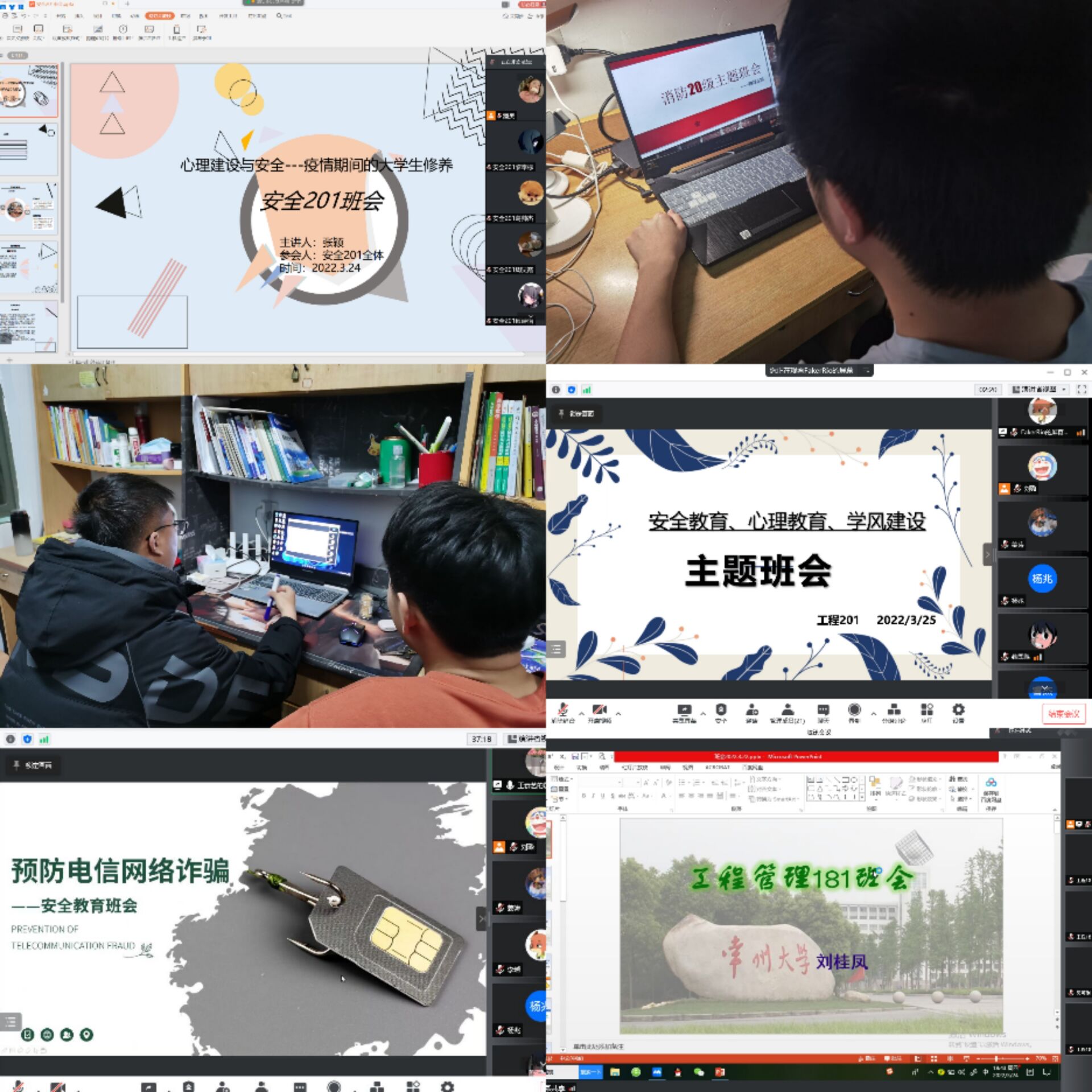 为加强疫情期间学生的安全防范意识,缓解封校期间学生的心理压力,树立良好的学习氛围,3月21日—3月31日期间,环境与安全工程学院各专业班级相继开展了月度主题线上班会。会议由各班教师班主任组织,班级全体学生参加。